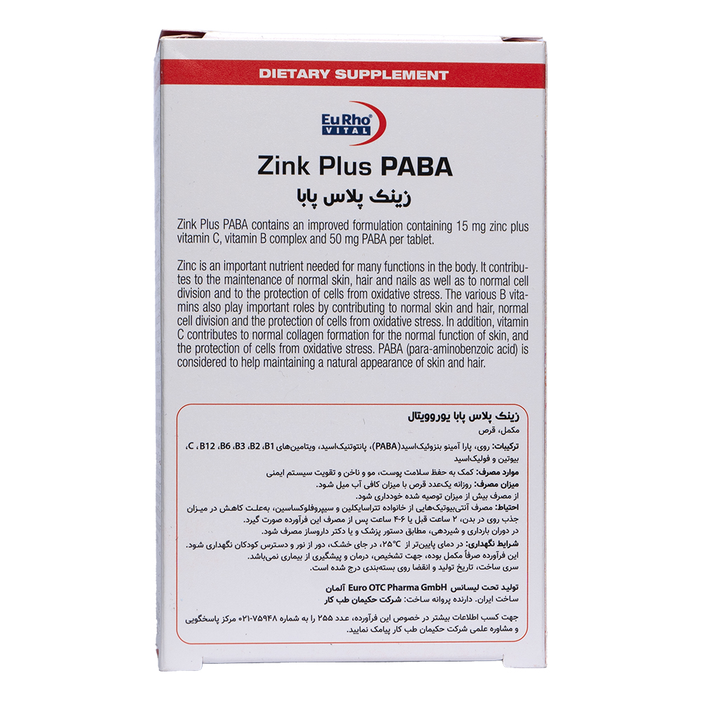 حاوی گروه ویتامین B، زینک 15 میلی گرم ، ویتامین C و پابا (پاراامینوبنزوییک اسید)