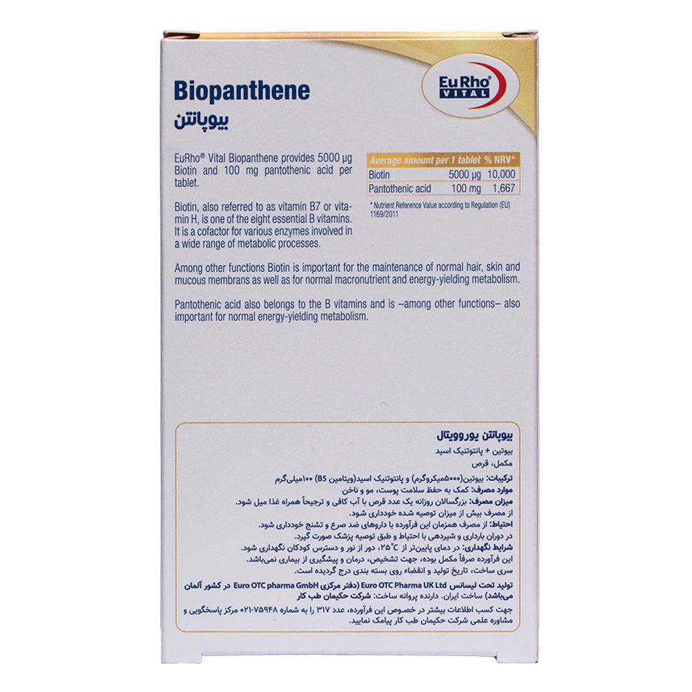 حاوی 5000 میکروگرم بیوتین و 100 میلیگرم پانتوتنیک اسید به ازای هر قرص