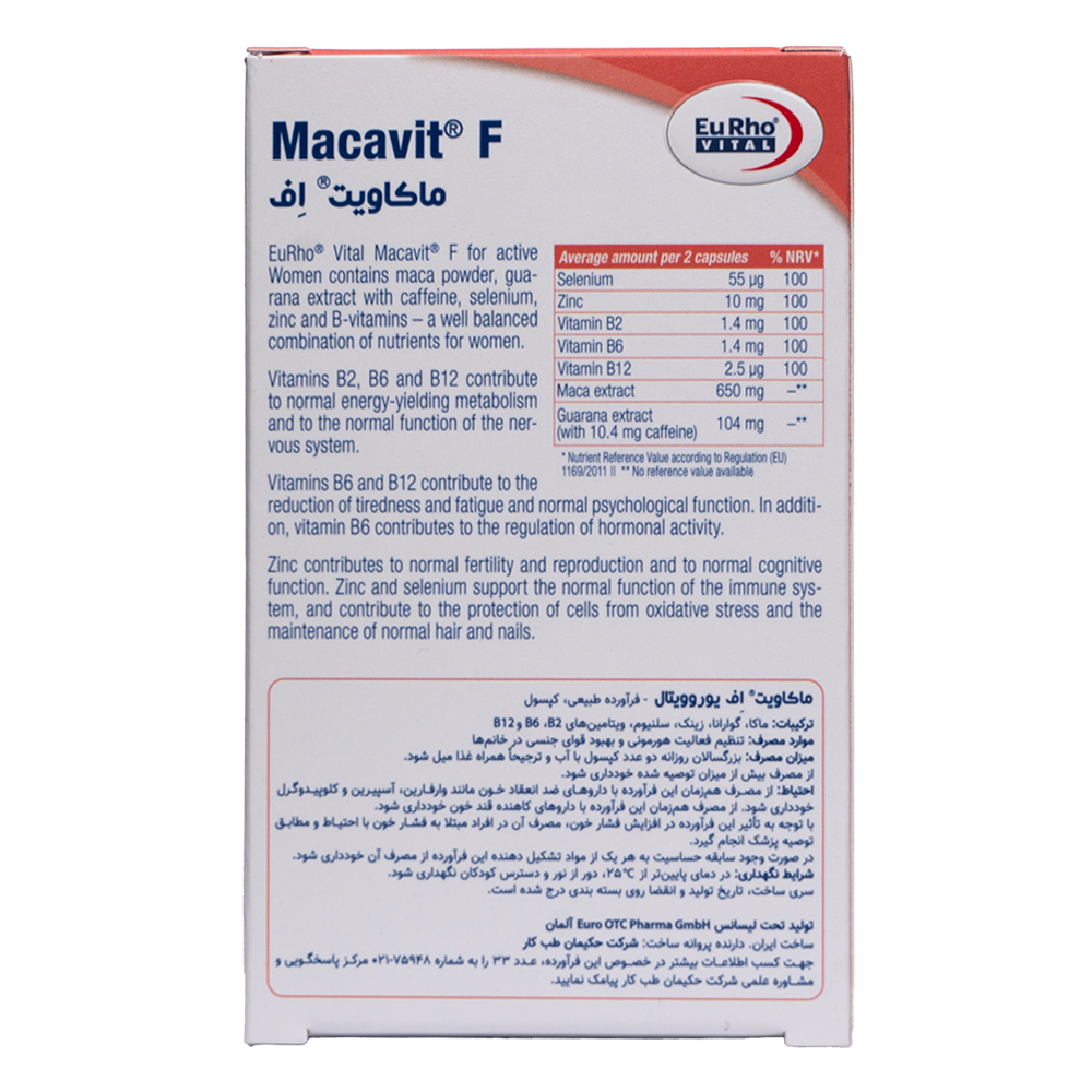 فرآورده طبیعی حاوی گیاهان ماکا و گوارانا، ویتامین B2، ویتامین B6، ویتامین B12، زینک و سلنیوم